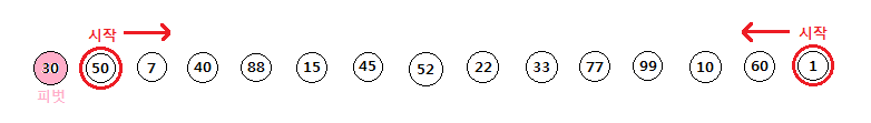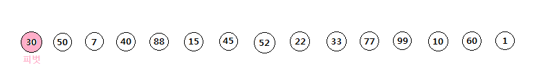 1. 먼저 아래의 데이터 중에 임의로 30을 뽑아 피벗으로 지정합니다.