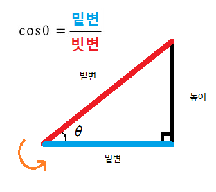 처음 배울 때 감이 잘 안 잡히지만 각도 Φ(쎄타)에 대한 빗변분의 밑변의 비율을 코사인이라고 알면 됩니다.