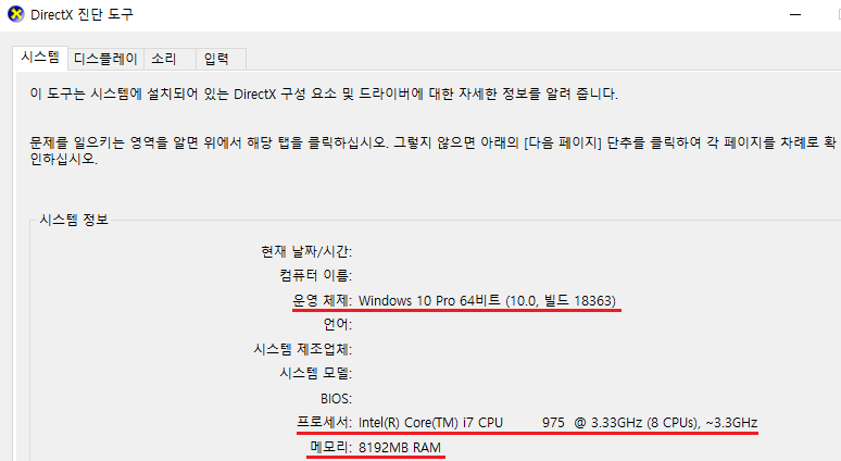 2. 아래와 같이 DirectX 진단 도구창이 뜨는데 내 컴퓨터의 윈도우가 몇인지 운영체제가 몇비트인지 알 수 있습니다.
