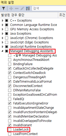 2. 아래와 같이 Managed Debugging Assistants - LoaderLockd의 체크박스를 해제해주면 됩니다.