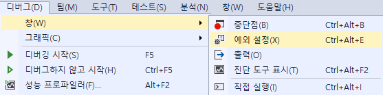 1. 디버그 - 창 - 예외 설정(단축키 : Ctrl + Alt + E)을 눌러줍니다.