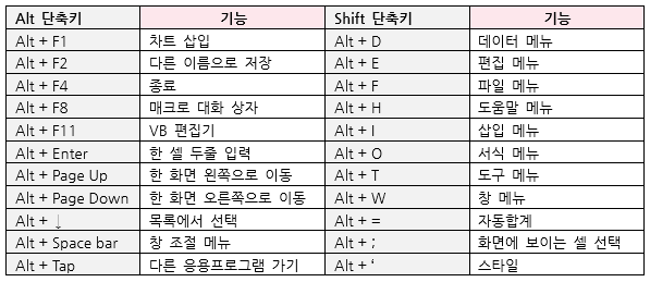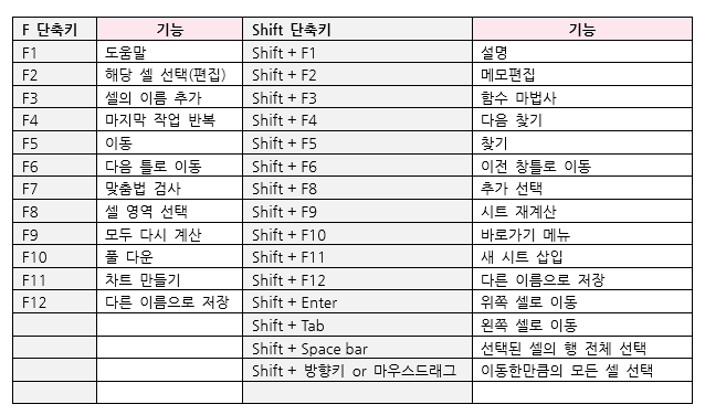 아래는 많이 쓰는 엑셀 단축키 모음입니다.