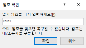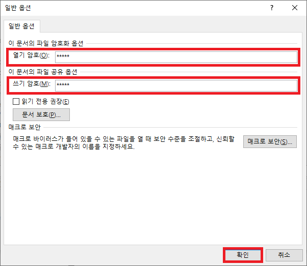 5. 열기 암호(열 때 쓰는 암호)와 쓰기 암호(문서를 작성할 수 있는 권한을 주는 암호)를 설정하고 확인을 누릅니다.