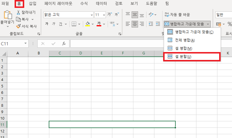 홈 - 병합하고 가운데 맞춤 - 셀 분할