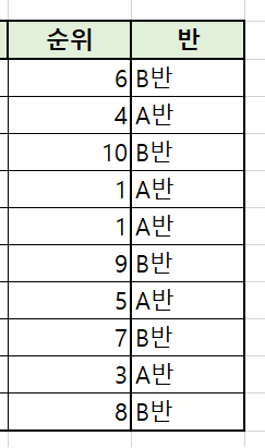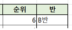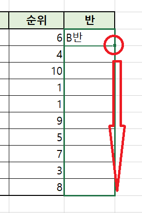 이렇게 구분도 록 조건을 정했습니다. 제일 처음 보이는 셀의 값은 5보다 큰 6이기 때문에 B 반이 나오는 것입니다. 이제 지난번에 했던 연속으로 값을 채우는 방법을 사용해서 아래쪽 순위에도 해당 수식을 붙여 넣기 해보겠습니다.