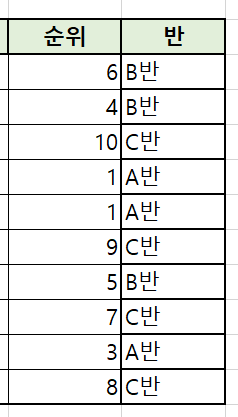 순위에 따라 각각 A반과 B반이 구분되었습니다. 여기서 좀 더 응용해서 사용해보도록 하겠습니다. 현재는 조건 1개만 사용해서 출력을 했는데, 조건을 살짝 변경해서 C반을 추가해보도록 하겠습니다.