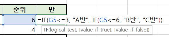 하나씩 천천히 살펴보겠습니다. IF 함수(체크할 조건, 참인 경우 결과값, 거짓인 경우 결과값) 이라고 말씀드렸었는데, 여기에서 거짓인 경우 한 번 더 체크를 해서 값을 나눈 것입니다. G5셀의 값이 3보다 작거나 같은 경우 이 조건이 참이면 A반, 거짓인 경우, 그럼 6보다 작거나 같은 값인지 체크해서 6보다 작거나 같은 값이면 B반 그것도 아니면 C반인 것입니다.