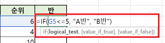 순위에 따라서 A반인지, B반인지 구분을 해보려고 합니다. 조건은 간단합니다. 특정 셀의 값이 5보다 작거나 같은지 비교하는 조건입니다.