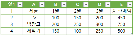 위 테이블에서 TV의 1월, 2월, 3월 판매량을 합산하고 싶다면 다음과 같이 SUM 함수를 사용할 수 있습니다.