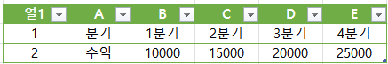 연간 총 수익을 계산하기 위해 B2에서 E2까지의 셀을 더하는 SUM 함수를 사용할 수 있습니다.