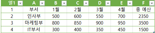 다음은 부서별 월간 예산을 관리하는 예시입니다.