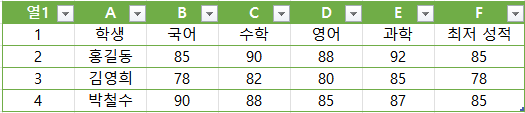 이 함수를 F4 셀까지 복사하면 각 학생의 과목별 최저 성적을 손쉽게 구할 수 있습니다.