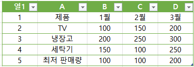 위 테이블에서 1월, 2월, 3월의 최저 판매량을 찾고 싶다면 다음과 같이 MIN 함수를 사용할 수 있습니다.