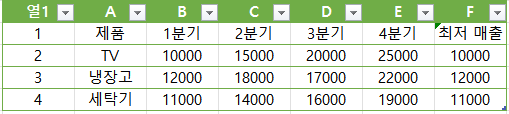이 함수를 F4 셀까지 복사하면 각 제품의 분기별 최저 매출을 손쉽게 구할 수 있습니다.