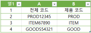 이 함수를 B2 셀에 입력하고 아래로 복사하면 각 제품 코드의 앞 4글자를 손쉽게 추출할 수 있습니다.