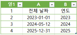 이 함수를 B2 셀에 입력하고 아래로 복사하면 각 날짜의 연도를 손쉽게 추출할 수 있습니다.