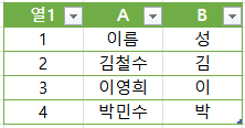 이 함수를 B2 셀에 입력하고 아래로 복사하면 각 이름의 첫 글자를 성으로 추출할 수 있습니다.