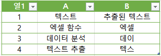 위 테이블에서 각 텍스트의 처음 2글자를 추출하고 싶다면 다음과 같이 LEFT 함수를 사용할 수 있습니다.