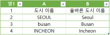 이 함수를 B2 셀에 입력하고 아래로 복사하면 각 도시 이름이 올바른 대소문자로 변환됩니다.
