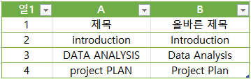 이 함수를 B2 셀에 입력하고 아래로 복사하면 각 제목이 올바른 대소문자로 변환됩니다.