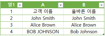 이 함수를 B2 셀에 입력하고 아래로 복사하면 각 고객 이름이 올바른 대소문자로 변환됩니다.
