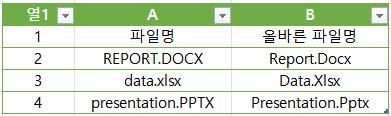 이 함수를 B2 셀에 입력하고 아래로 복사하면 각 파일명이 올바른 대소문자로 변환됩니다.